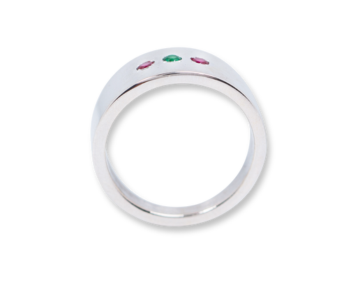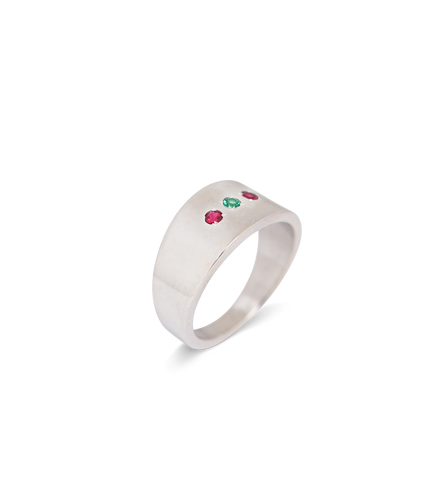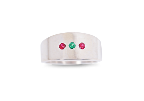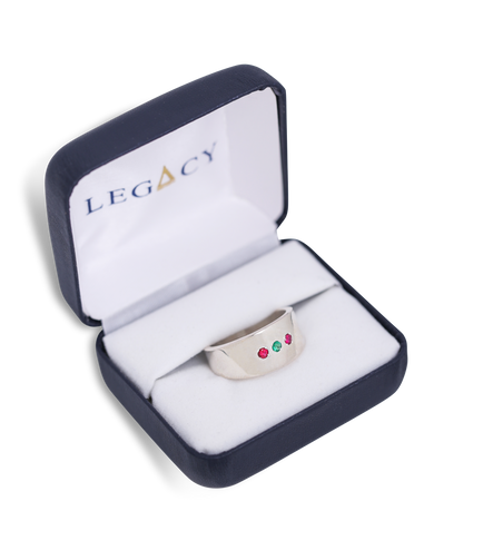 Expertly cast in your choice of Sterling Silver, 10K, or 14K Gold, the subtle symbolism of the ellipses is masterfully set with Phi Psi's signature red (ruby) and green (emerald) stones. The Fraternity's deeply meaningful motto, We Live + Flourish, is etched inside each ring. The product of extensive field testing, this tapered band is extremely comfortable to wear, even for the "non-jewelry-wearing" Phi Psi. The simplicity and wearability of this Brotherhood Ring makes an ideal gift or personal purchase, with a range of metal qualities offered to suit your personal preference and budget. The Brotherhood Ring comes complete with Legacy's Lifetime Warranty, in a handsome presentation box for a lifetime of wear and care, along with a complimentary polishing cloth. Band measures approximately 9/16" at its widest point.