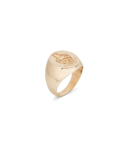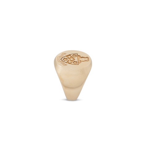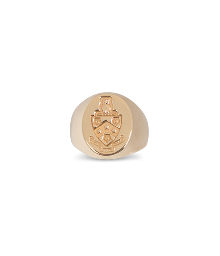 This classically styled signet ring features the Phi Gamma Delta coat of arms, in deeply incised detail, on the highly polished face of this striking oval signet ring. The crest details of the Snowy White Owl above the shield are subtly darker for just enough contrasting detail, and like the rest of this ring's deep-cut details, will take on a handsome patina over years of maintenance-free wear. Comes complete with our Legacy Lifetime Warranty, for complimentary service at any time for resizing or refurbishment, and is shipped to you in our branded leatherette ring box, along with a professional polishing cloth. Ring measures approximately 11/16" vertically by 9/16" wide.
