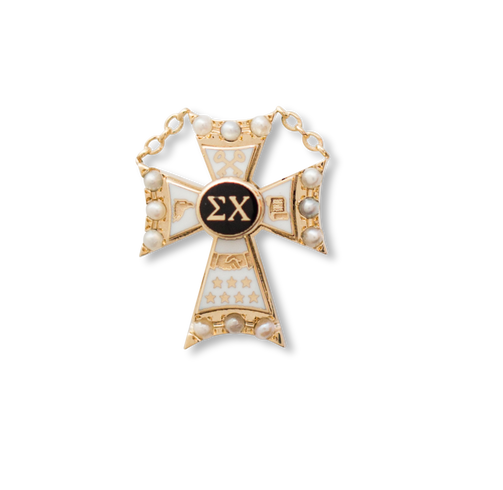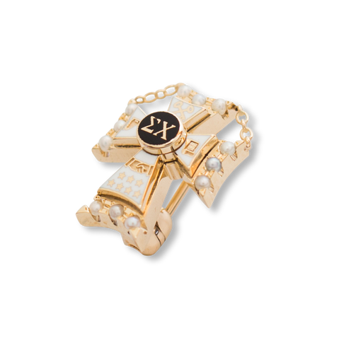 It is well known in the Greek world that no fraternity reveres their sweethearts quite like Sigma Chi. This diminutive crown pearl sweetheart pin, delicately set with 12 genuine seed pearls around the enameled symbols of the Sigma Chi cross, measures just over 1/2 the size of the standard Sigma Chi member badge, and yet makes a memorably large and lasting impression when presented! Available crafted in your choice of 14K Gold, 10K Gold, or Sterling Silver. Comes ready for presentation in our deep blue leatherette presentation box. (Given the small space available, engraving is optional and limited to seven (7) characters maximum.)