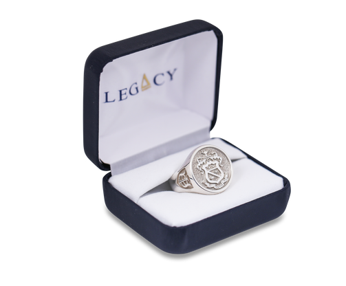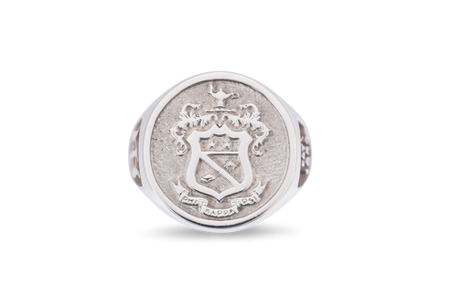 This newly designed and introduced round signet ring handsome incorporates three deeply meaningful images that are readily recognizable to all Phi Psi Brothers: The Fraternity's unmistakable coat of arms commands the top of this ring in intricate detail, with the Fraternity's historical interlocking Greek letters features in bas relief on the left shank, and the Fraternity's founding date on the right shank, in polished detail atop a contrasting recessed background. This is a classically designed collegiate ring, yet one chosen clearly by those who revere their fraternal experience as the epitome of their collegiate career. Signet Ring top measures approximately 3/4" in diameter.